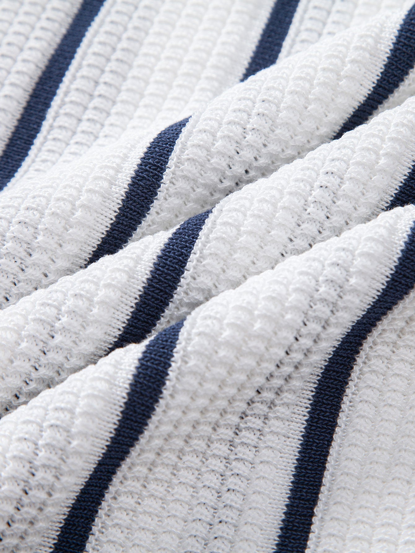 Rinnova il tuo look quotidiano con questa camicia a righe lavorata a maglia con bottoni, una perfetta combinazione di fascino vintage e comfort moderno. Le righe verticali e la texture a maglia traspirante aggiungono una sottile raffinatezza al tuo guardaroba casual.