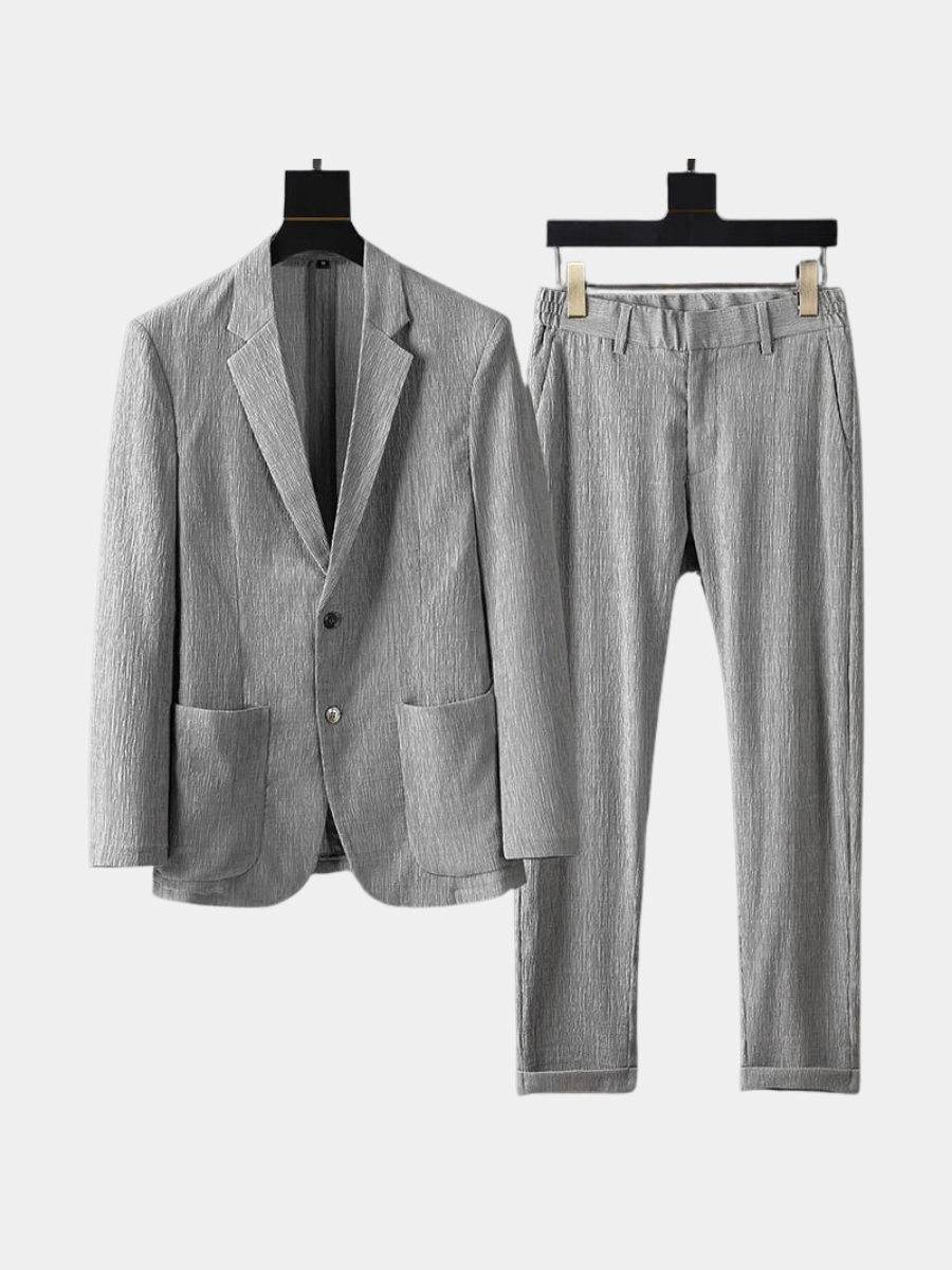 - Il completo presenta un blazer monopetto con chiusura a due bottoni e un paio di pantaloni coordinati