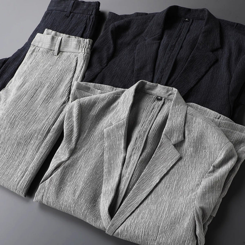 Il Completo Estivo Roberto Russo abbina un elegante blazer a pantaloni coordinati, entrambi realizzati in un tessuto leggero e senza pieghe. Che tu stia partecipando a un matrimonio estivo o semplicemente cercando di fare colpo, questo completo offre una finitura di alta qualità con un'eleganza senza sforzo.